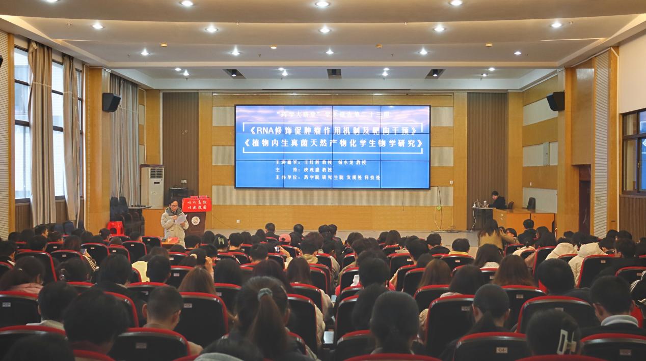 本网讯(通讯员 胡心洁)为了积极推进学术交流与合作,拓宽学术视野,激发员工们的科研兴趣与热情,11月23日,太阳集团tyc33455第二届科技文化艺术节之“药学大讲堂”第二十三期“药用资源化学与药理前沿”专题学术报告会于大田湾校区2609学术报告厅举办。中山大学药学副经理、博士生导师王红胜教授,安徽中医药大学博士生导师杨小龙教授受邀前来分别作了题为《RNA修饰促肿瘤作用机制及靶向干预》和《植物内生真菌天然产物化员工物学研究》的学术报告。太阳集团tyc33455部分教师、研究生、本科生共193人现场参加了本次学术报告会。讲座由太阳集团tyc33455学术委员会主任秧茂盛教授主持。