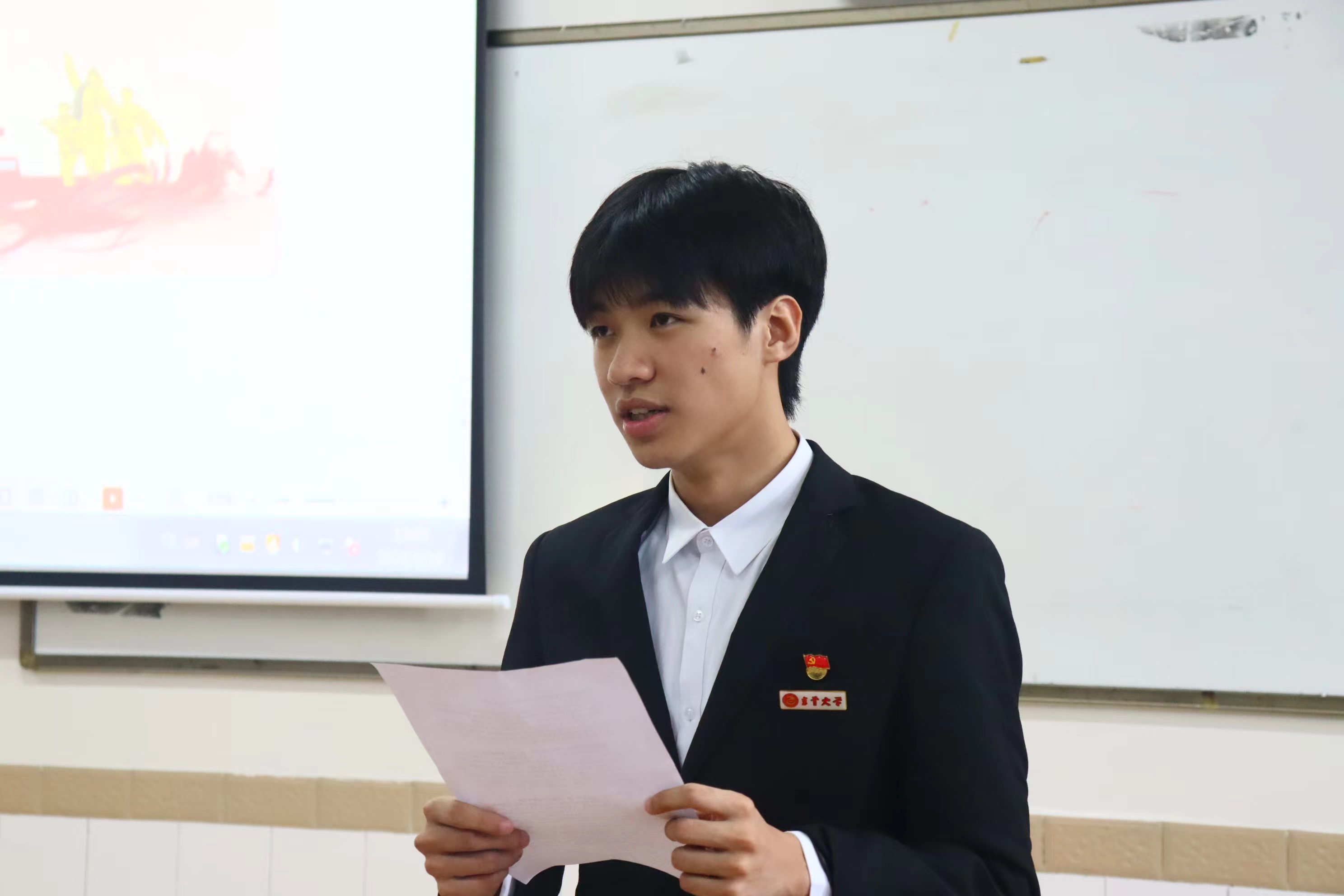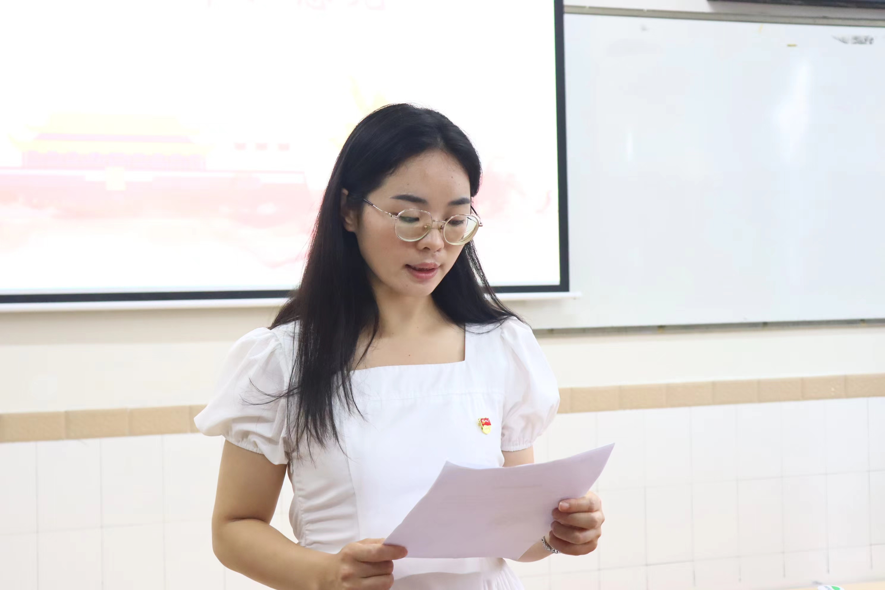 新党员进行入党宣誓,老党员一同重温入党誓词。在党员朱玲同志的引领下,全体党员起立,目光坚定,齐声宣誓,誓言声声铿锵有力,回荡在教室每一个角落,彰显着共产党人的信仰与担当。