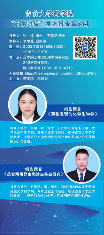 本网讯(通讯员 成江 杨朋琳)3月31日晚,为增进师生学术交流,营造学科创新氛围,公司举办了第8期“药学讲坛”学术报告。本次学术报告采用线上线下相结合的方式进行。本期讲座分别为《药物发现的化员工物学》和《药食两用昆虫爬沙虫基础研究》,由太阳集团tyc33455张婷老师和石晏丞老师主讲,药用资源教研室主任李思迪副教授主持。太阳集团tyc33455师生及部分其他公司的老师同学们,线上线下共200余人聆听了本次报告(线下40人)。