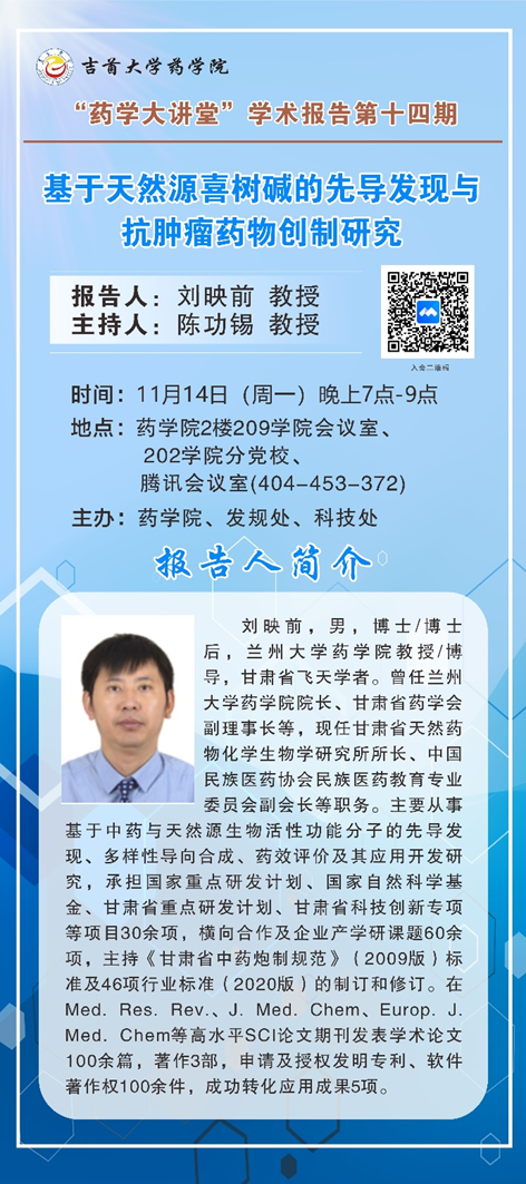 “药学大讲堂”第十四期|基于天然源喜树碱的 先导发现与抗肿瘤药物创制研究
