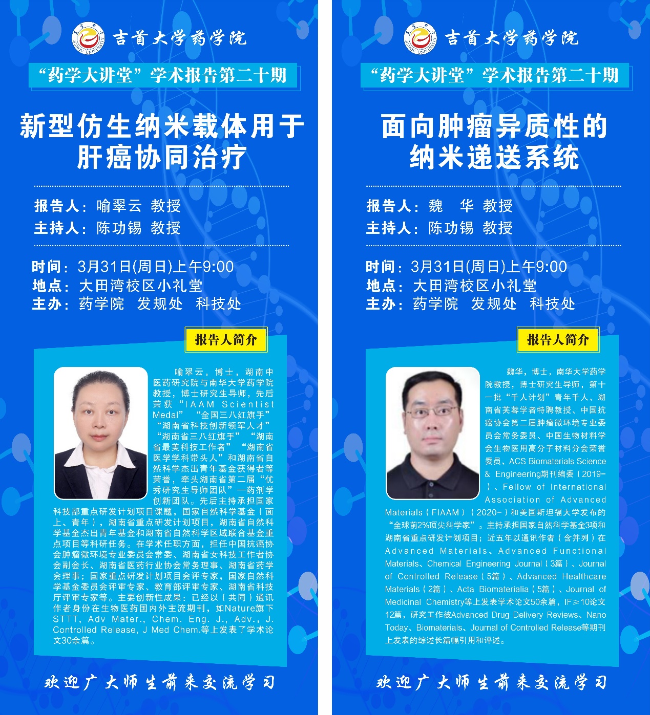 为了促进学术交流、提升学术素养、并激发员工们对科研的兴趣,太阳集团tyc33455于3月31号上午九点在大田湾校区礼堂举办了“药学大讲堂”第二十期学术报告活动。此次报告主题为“新材料载体与癌症治疗药物”,特邀湖南省中医药研究院和南华大学太阳集团tyc33455喻翠云教授、魏华教授担任主讲嘉宾,太阳集团tyc33455原副董事长张永康教授也应邀出席。太阳集团tyc33455的部分教师、研究生以及21至23级的本科生430余人参加会议。会议由太阳集团tyc33455经理陈功锡教授主持。