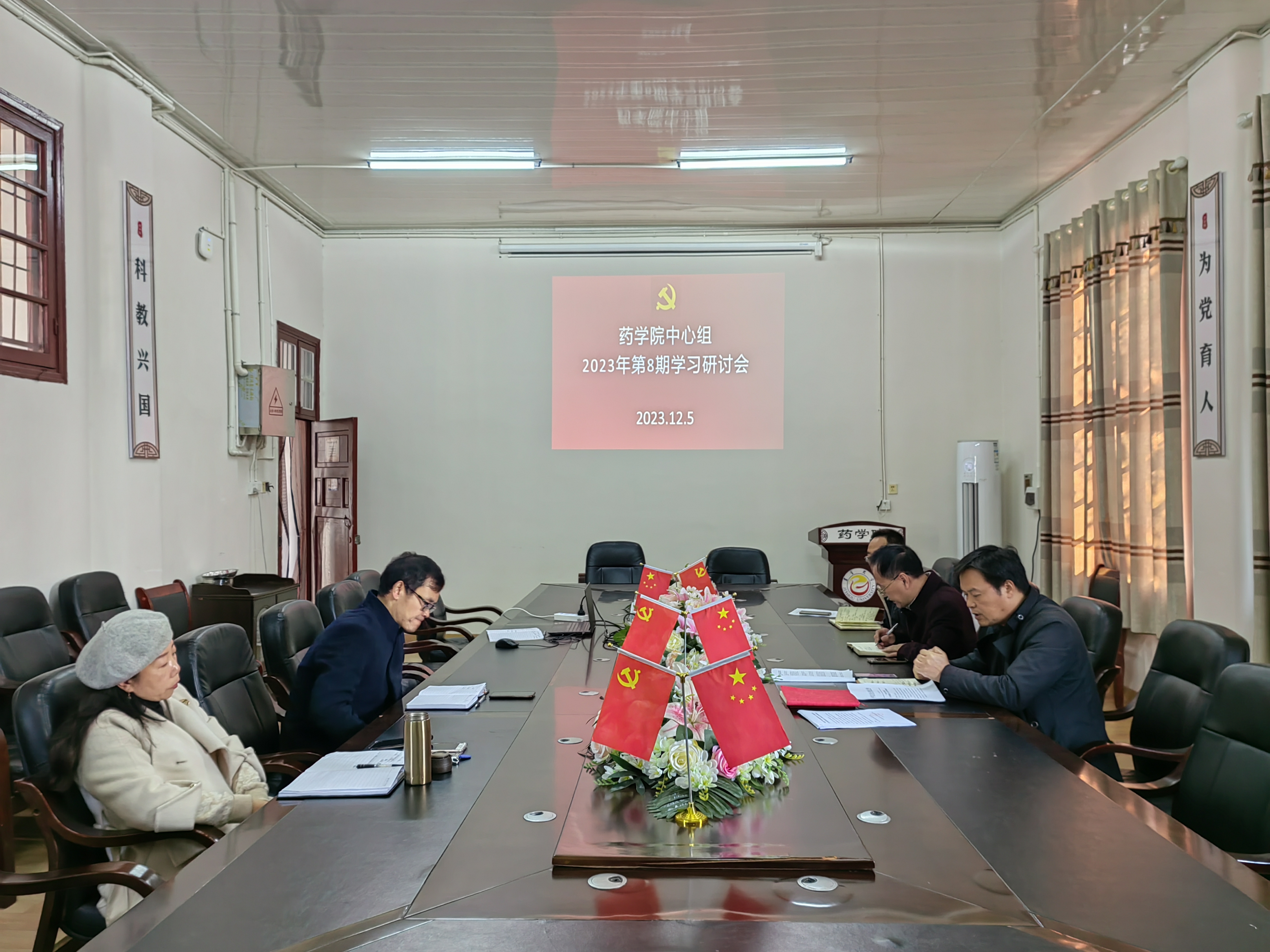 图为 太阳集团tyc33455中心组开展教育家精神学习研讨。