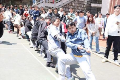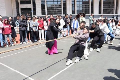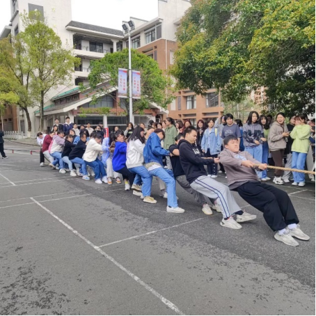 同学们的加油声、欢呼声、跺脚声融成一片,交战双方稳扎马步,咬紧牙关,毫不退缩,用力拉拽着手中的长绳。心往一处想,劲往一处使,拧成一股绳,彰显出团结的力量!