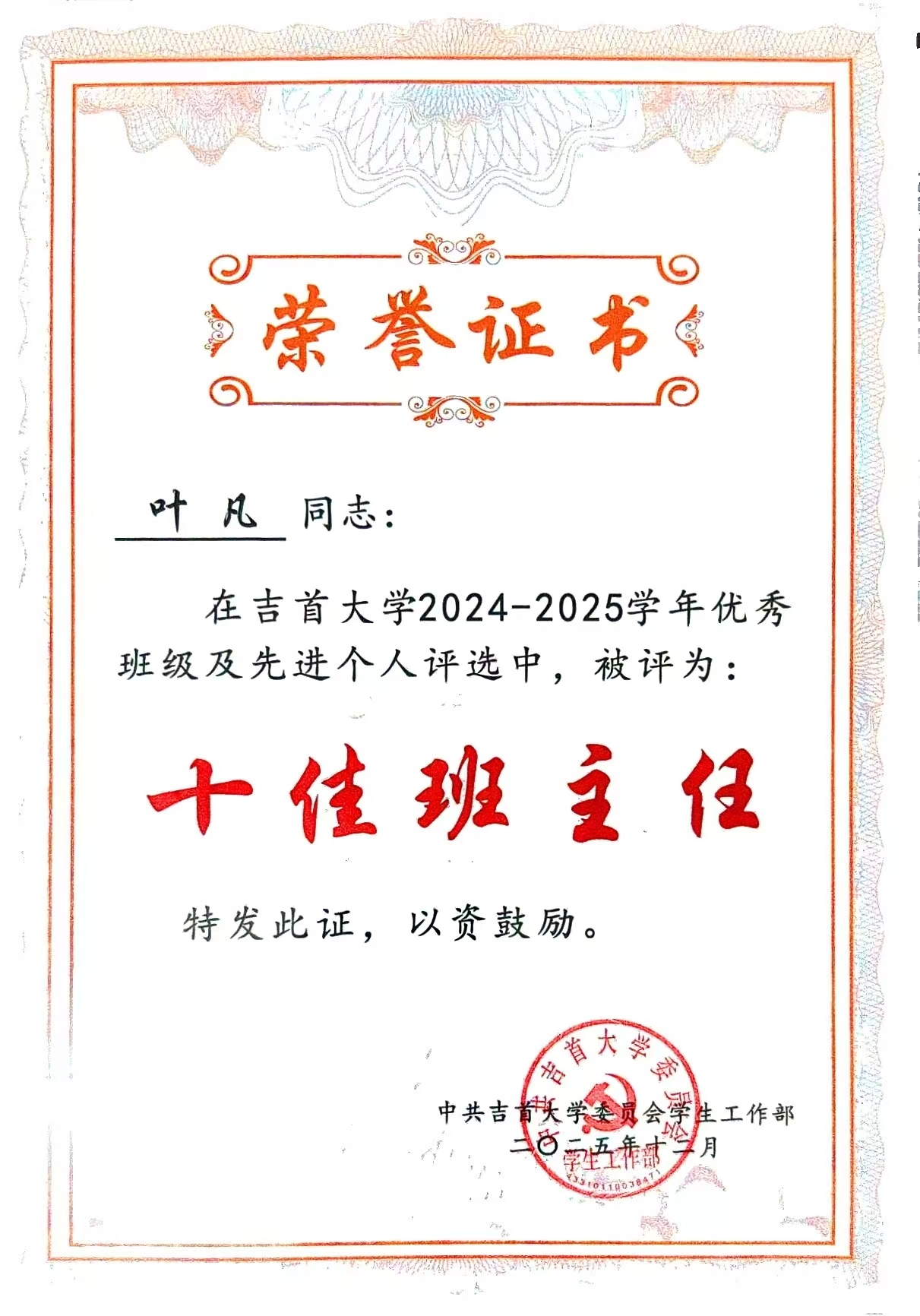 图为 十佳班主任荣誉证书与十佳班集体奖牌