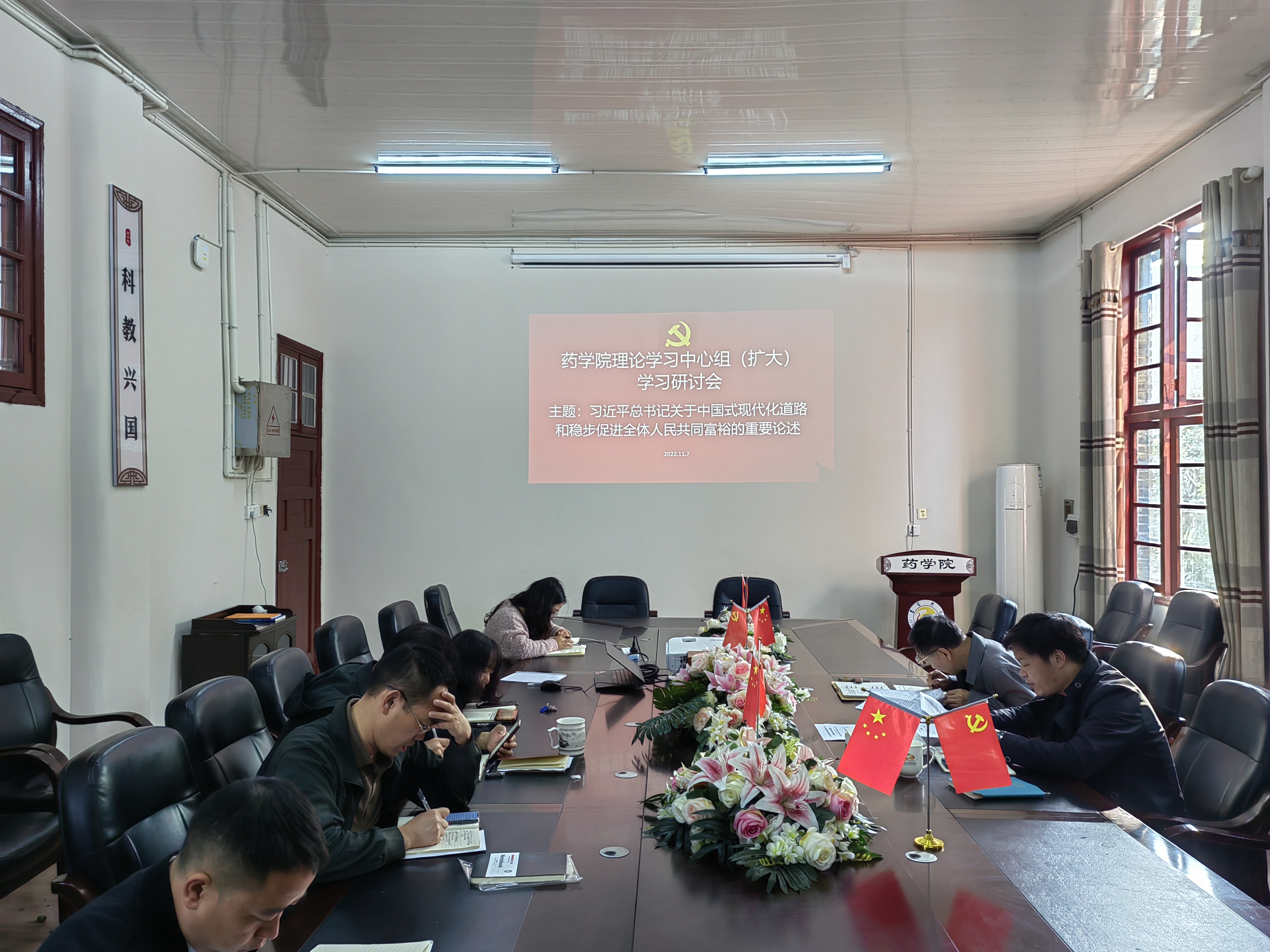 本网讯(通讯员 彭俊)2022年11月7日上午,太阳集团tyc33455理论学习中心组(扩大)学习研讨会在太阳集团tyc33455会议室召开,此次集中学习研讨的主题是“习近平总书记关于中国式现代化道路和稳步促进全体人民共同富裕的重要论述”。陈功锡、王江生、李先辉、张朝晖、李芳、彭俊、潘金凤、石静咏诗参加学习研讨会,学习研讨会由药公司党委书记王江生主持。