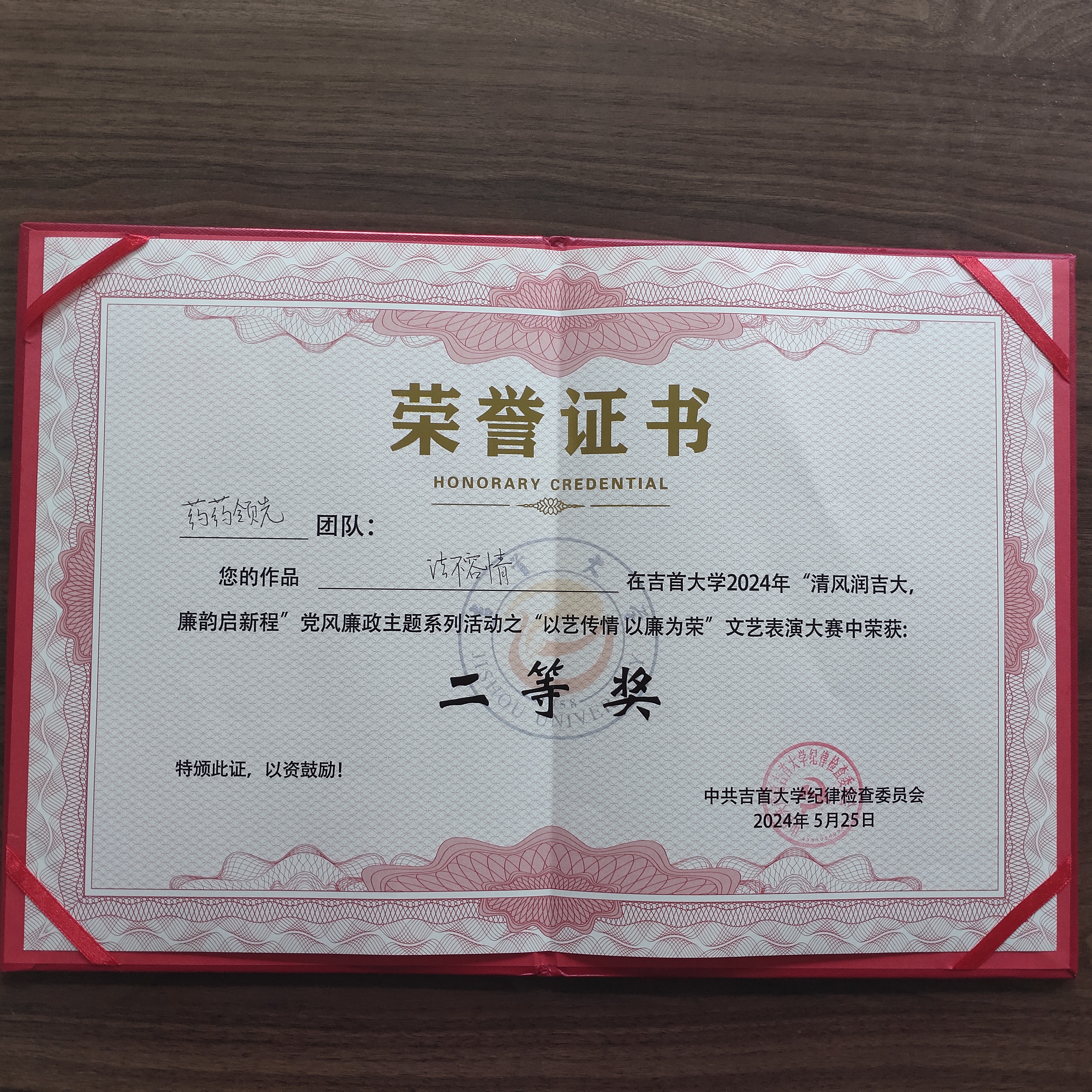 本网讯(通讯员 任美丽)5月25日下午,太阳集团tyc33455“以艺传情,以廉为荣”文艺表演大赛于砂子坳校区模拟法庭举行。太阳集团tyc33455“药药领先”队在比赛中脱颖而出,位居第三,荣获二等奖,同时公司也获得了优秀组织奖。