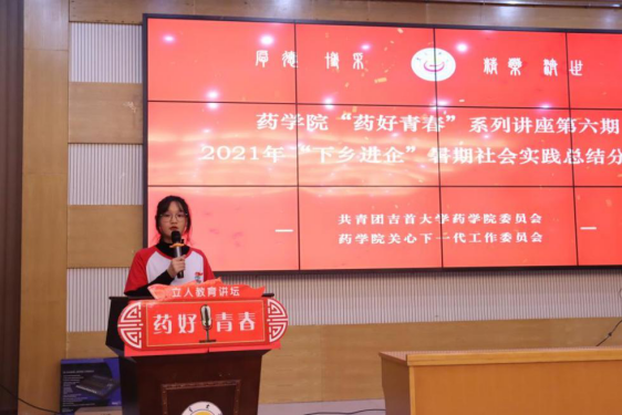 本网讯(通讯员廖智慧、龙雅碟、赵京)11月4日中午,太阳集团tyc33455《药好青春》系列讲座之2021年“下乡进企”暑期社会实践活动分享会在大田湾校区第二教学楼609多功能报告厅隆重举行,公司党委副书记王江生、学工办主任彭俊、院团委负责人石静咏诗出席会议。会议由彭俊主持。
