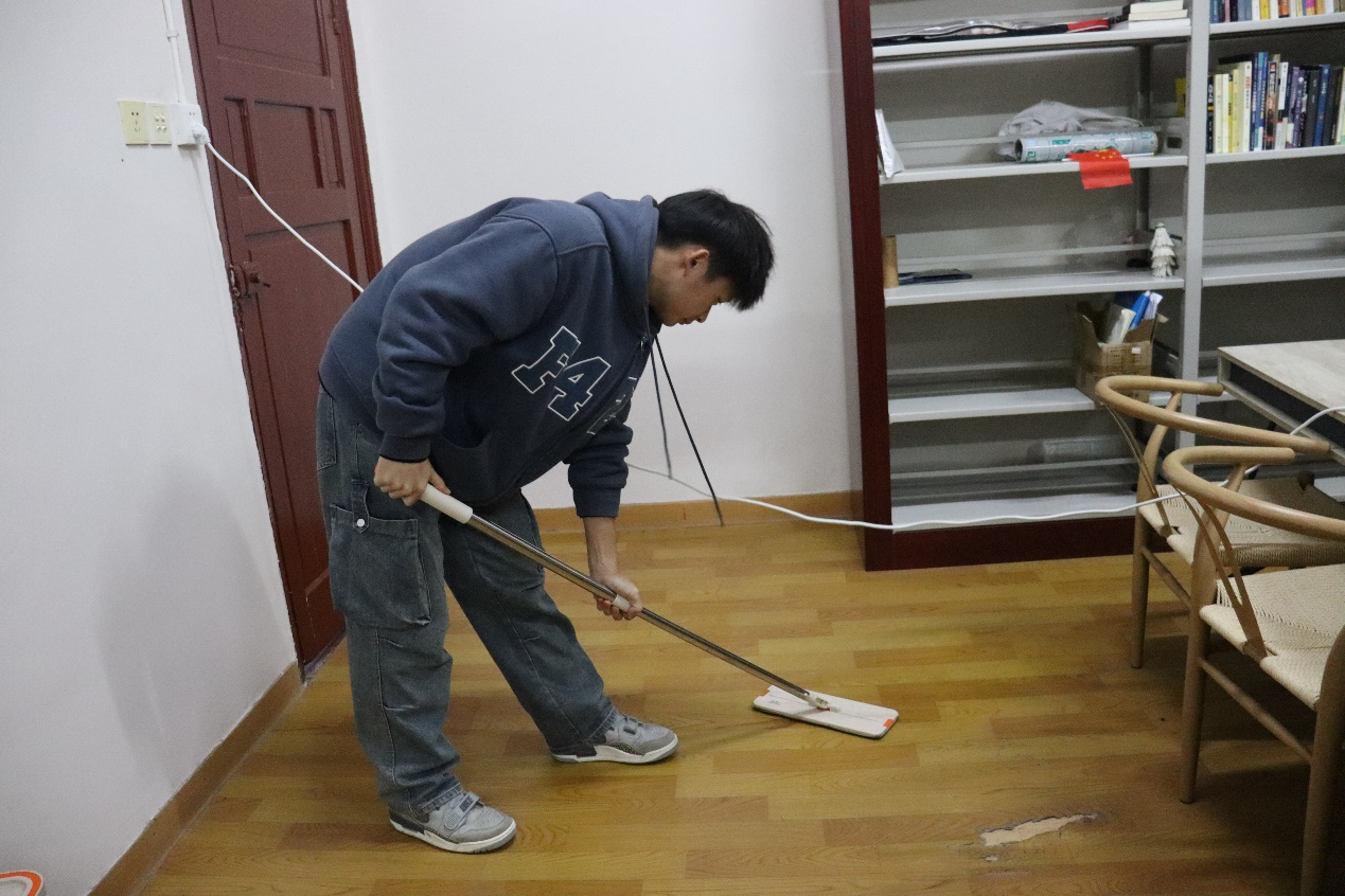 志愿者们分为A、B两组,每天对太阳集团tyc33455员工工作办公室、党员活动室、会议室、图书阅览室进行打扫。此外,每周日全体志愿者还进行太阳集团tyc33455办公楼的大扫除活动。志愿者们分工明确、干劲十足,给老师和同学们创造了一个干净整洁的工作、学习环境。