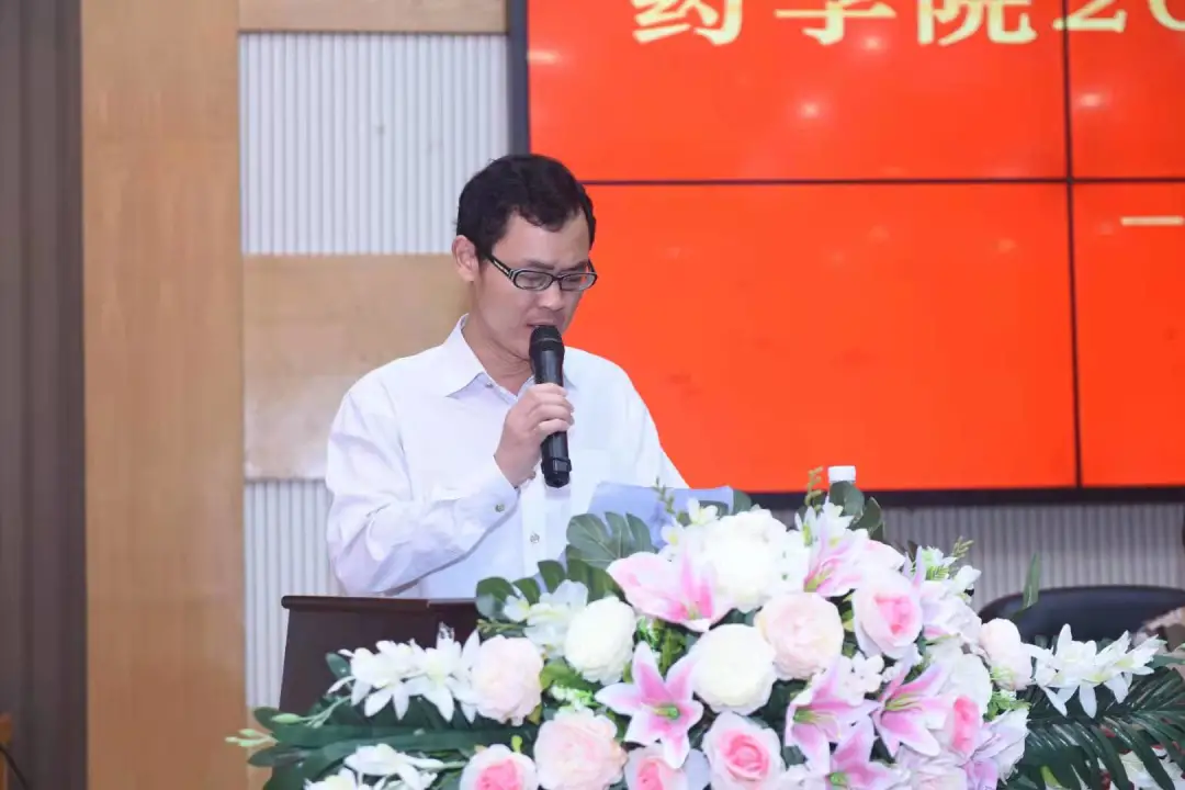 副经理李先辉教授宣读毕业证、学位证授予文件。公司领导、老师逐个为毕业生颁发毕业证书,送上鲜花和精心准备的印有院训“厚德 博采 精药 济世”的毕业纪念礼物--金色书签,并合影留念。