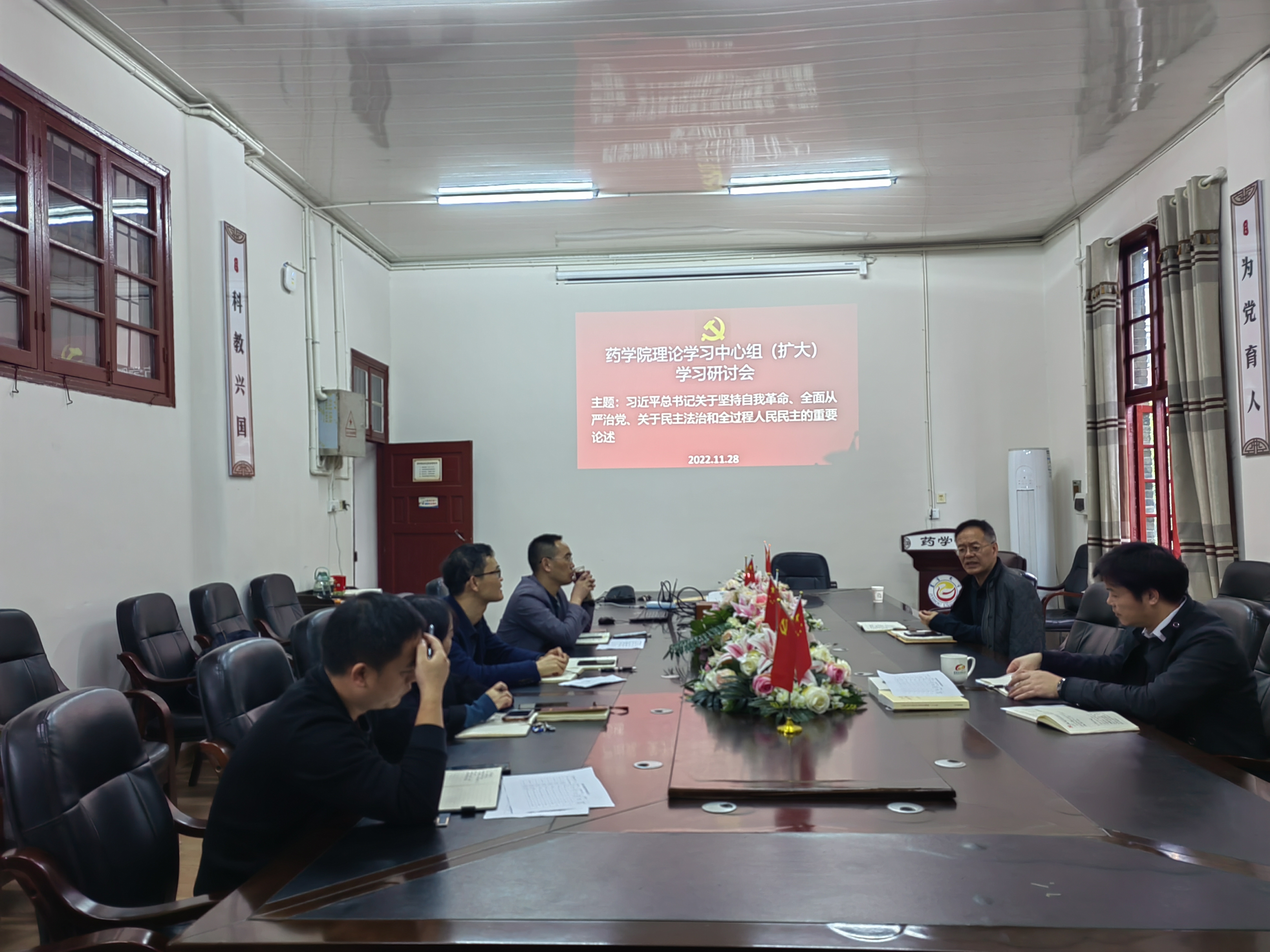 王江生作学习研讨领学并作中心发言。大家学习了《习近平谈治国理政》第四卷和《习近平关于全面从严治党论述摘编》中关于自我革命、全面从严治党、民主法治和人民民主的重要论述。