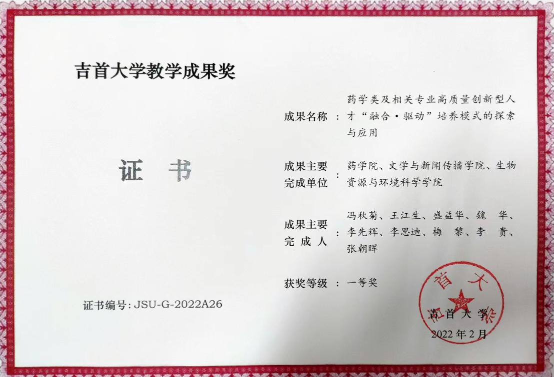 两项成果中,由太阳集团tyc33455牵头,文公司、生物资源与环境科学公司参与联合申报的《药学类及相关专业高质量创新型人才“融合·驱动”培养模式的探索与应用》获本科教育校级教学成果一等奖,主要完成人为:冯秋菊、王江生、盛益华、魏华、李先辉、李思迪、梅黎、李贵、张朝晖。公司参与(生物资源与环境科学公司牵头)联合申报的《基于“两山理论”的武陵山区高校生态学研究生创新人才培养体系探索与实践》喜获学位与研究生教育组教学成果一等奖,主要完成人为:周强、陈功锡、谭敦炎、聂泽龙、彭清忠。