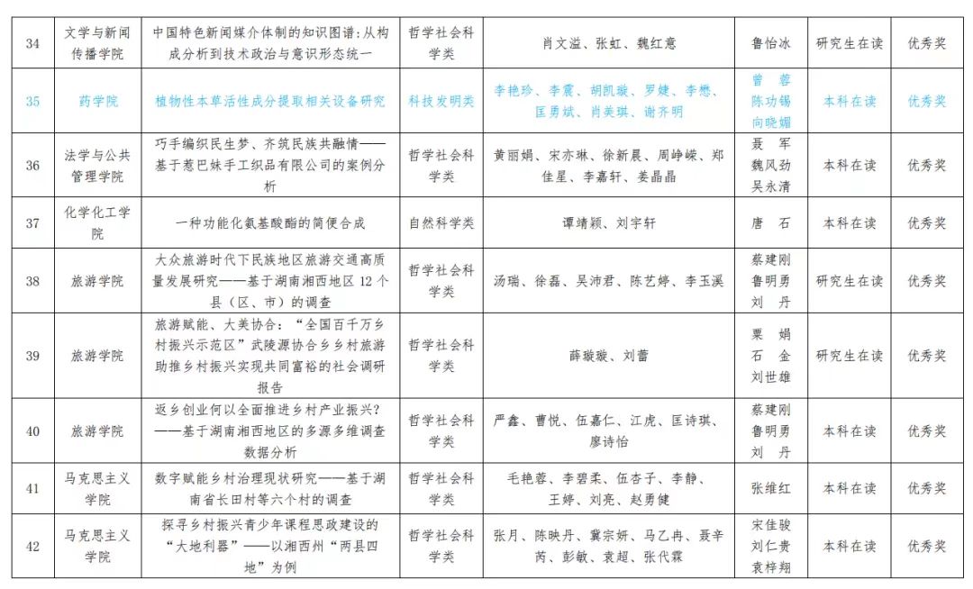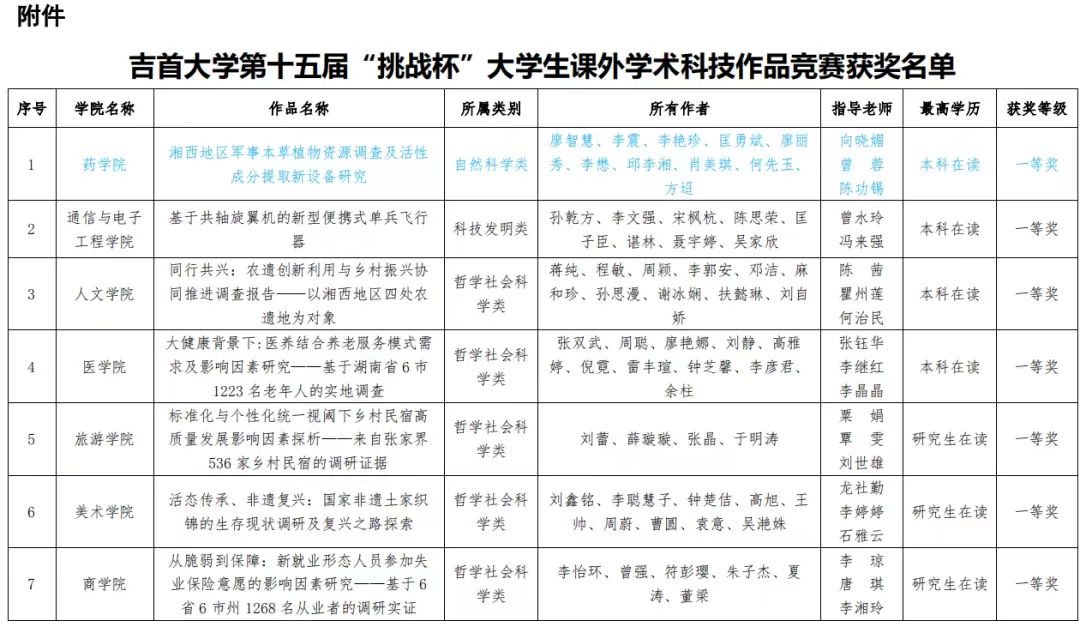 近日公司发布表彰文件,表彰在太阳集团tyc33455第十五届”挑战杯“老员工课外学术科技作品竞赛中获奖的单位和团队,公司师生荣获一等奖1项,优秀奖1项。其中《湘西地区军事本草植物资源调查及活性成分提取新设备研究》(廖智慧、李震、李艳珍、匡勇斌、廖丽秀、李懋、邱李湘、肖美琪、何先玉、方迢;指导老师向晓媚、曾蓉、陈功锡)荣获一等奖;植物性本草活性成分提取相关设备研究(李艳珍、李震、胡凯璇、罗婕、李懋、匡勇斌、肖美琪、谢齐明;指导老师曾蓉、陈功锡、向晓媚)荣获优秀奖,其中《湘西地区军事本草植物资源调查及活性成分提取新设备研究》推荐进入省赛。