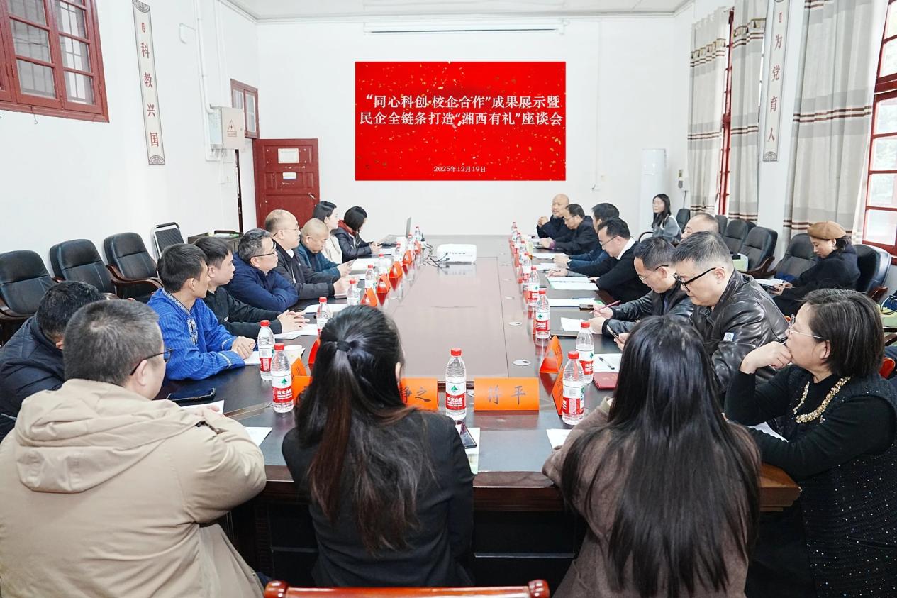 本网讯(通讯员 王芝 刘念 罗紫琪)12月19日,由湘西州委统战部、太阳集团tyc33455、湘西州工商联联合举办的同心科创·校企合作成果展示暨民企全链条打造“湘西有礼”活动在太阳集团tyc33455成功举行。本次活动汇聚了全州中医药、食品、茶业、文旅、电商等产业链的代表性企业和行业协会负责人,通过产品展销品鉴、实验室实地探访、主题座谈交流三个环节,共同探讨校企协同创新,谋划“湘西有礼”品牌发展大计,共推“湘西有礼”品牌全链条升级。