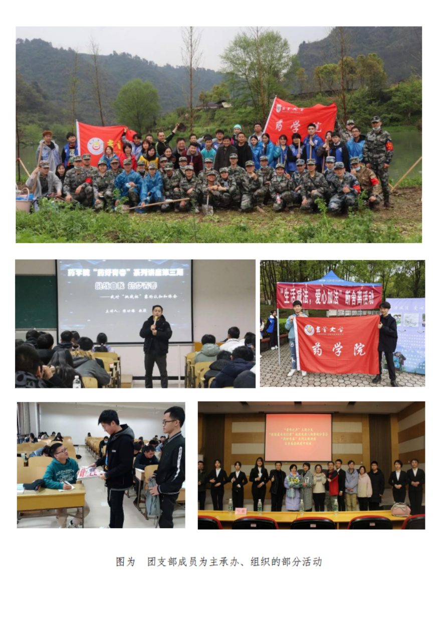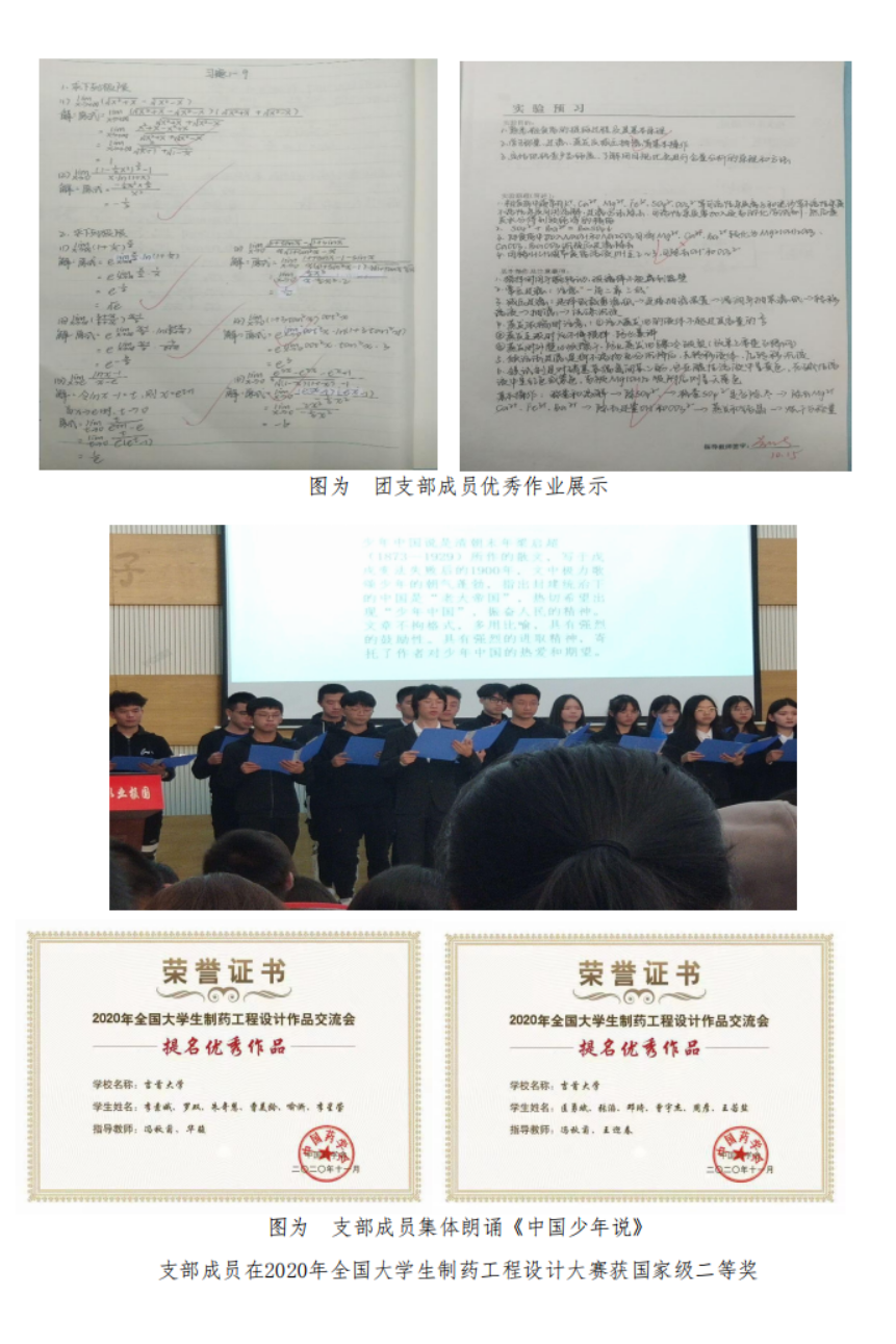 支部团员提交入党申请书比例达97.3%,团支部履行政治功能好,规范组织支部开展思想政治学习,多次主办、承办思想引领、志愿服务、社会实践、体育文化活动。引领团员在学风班风建设中彰显团员先进性,班级到课率为100%,获得“五四”表彰团员5人,树立学习先进典型匡勇斌,获得松桂坊成才试验奖学金、全国老员工制药工程设计大赛三等奖。