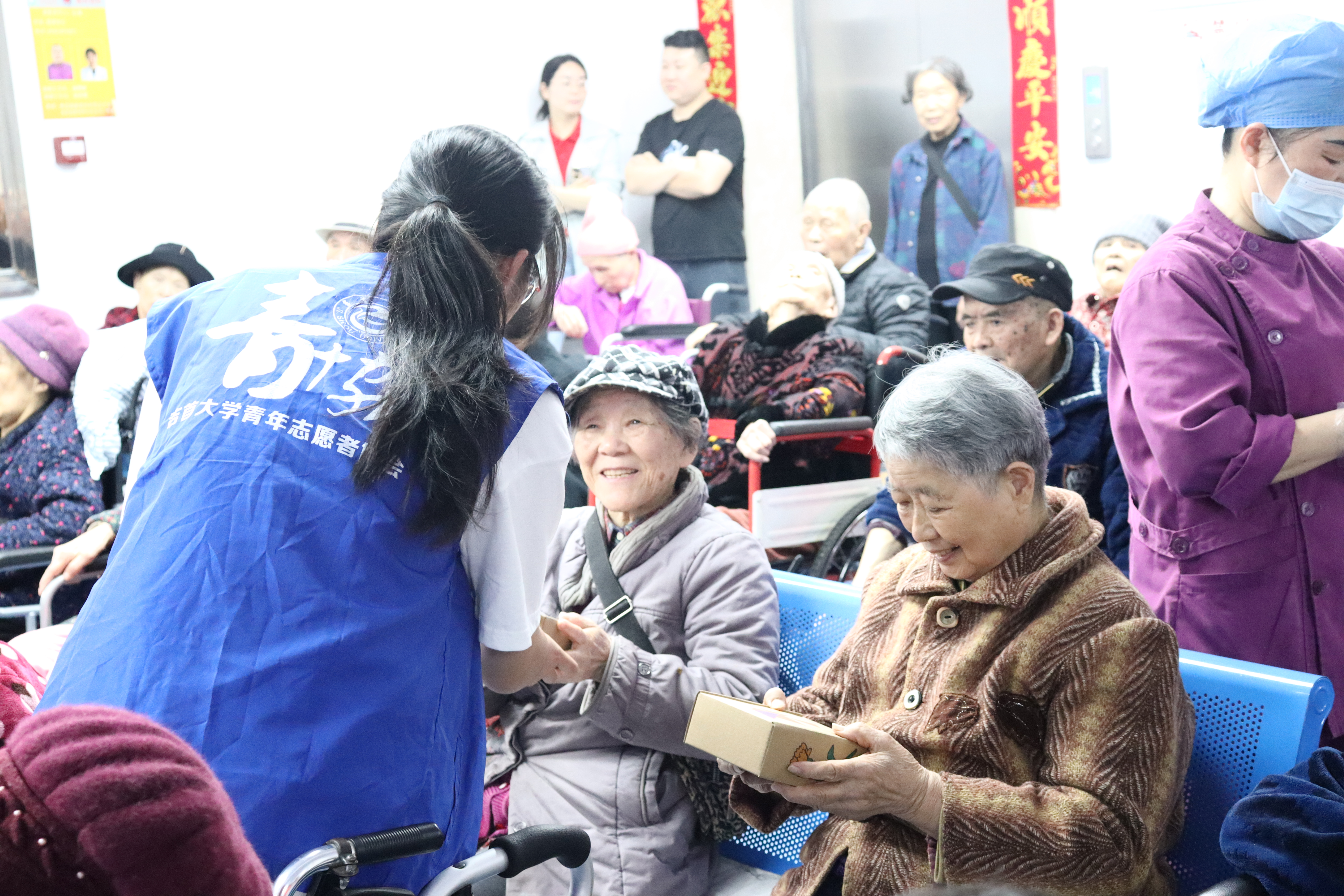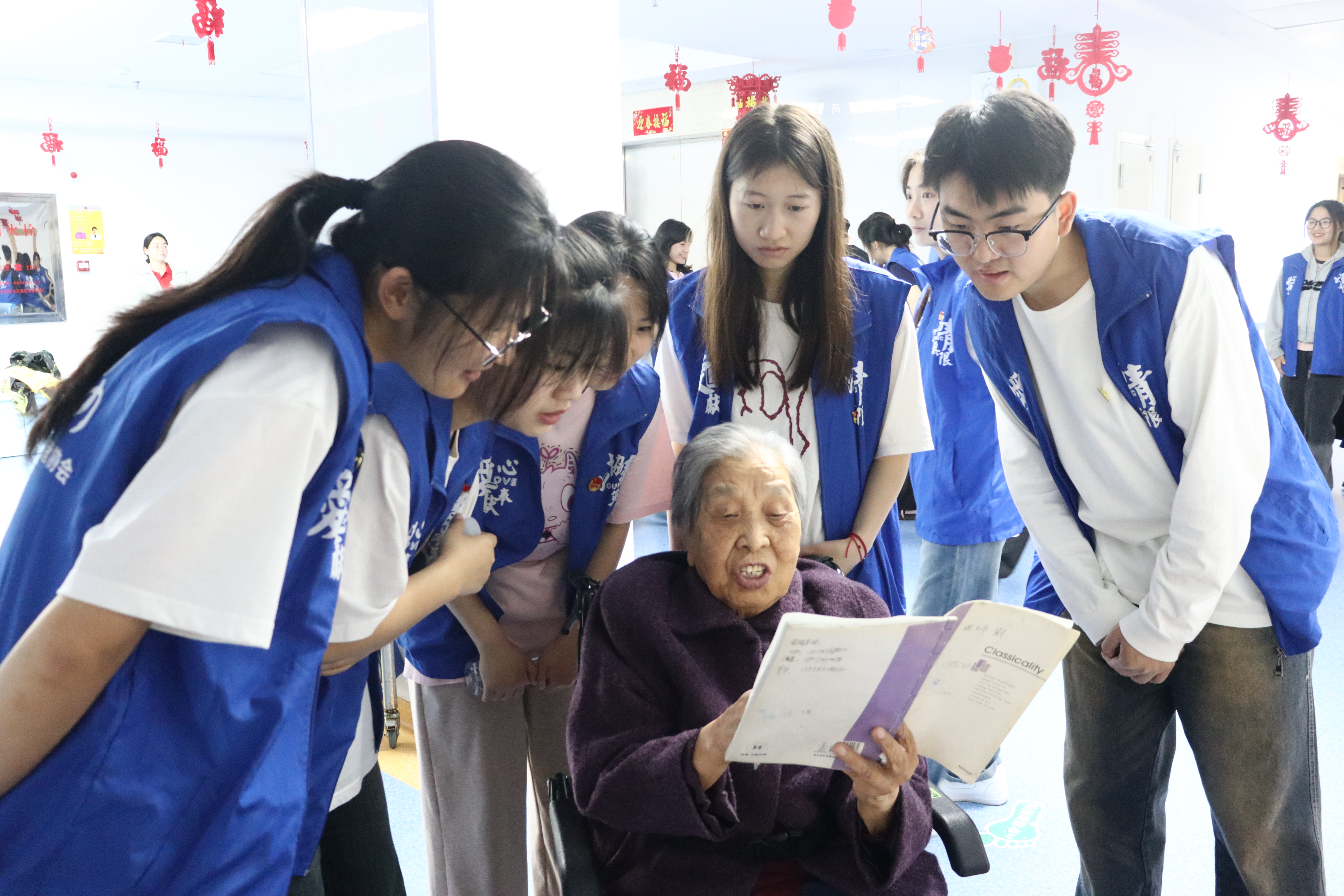 活动当天,志愿者们带着精心准备的礼物早早地来到医养中心,为老人们打扫、整理房间,让老人们居住的环境更加整洁舒适,还与老人们交流互动,认真倾听老人们的心声。镜头拉近,志愿者们帮助一位90岁的婆婆识字、念字,婆婆拉着志愿者的手,说:“你们要努力学习,以后要报效国家、报答党”。老人们的想法是纯粹的,即便只是对学子们的几句叮咛,也想着要为社会做些什么。