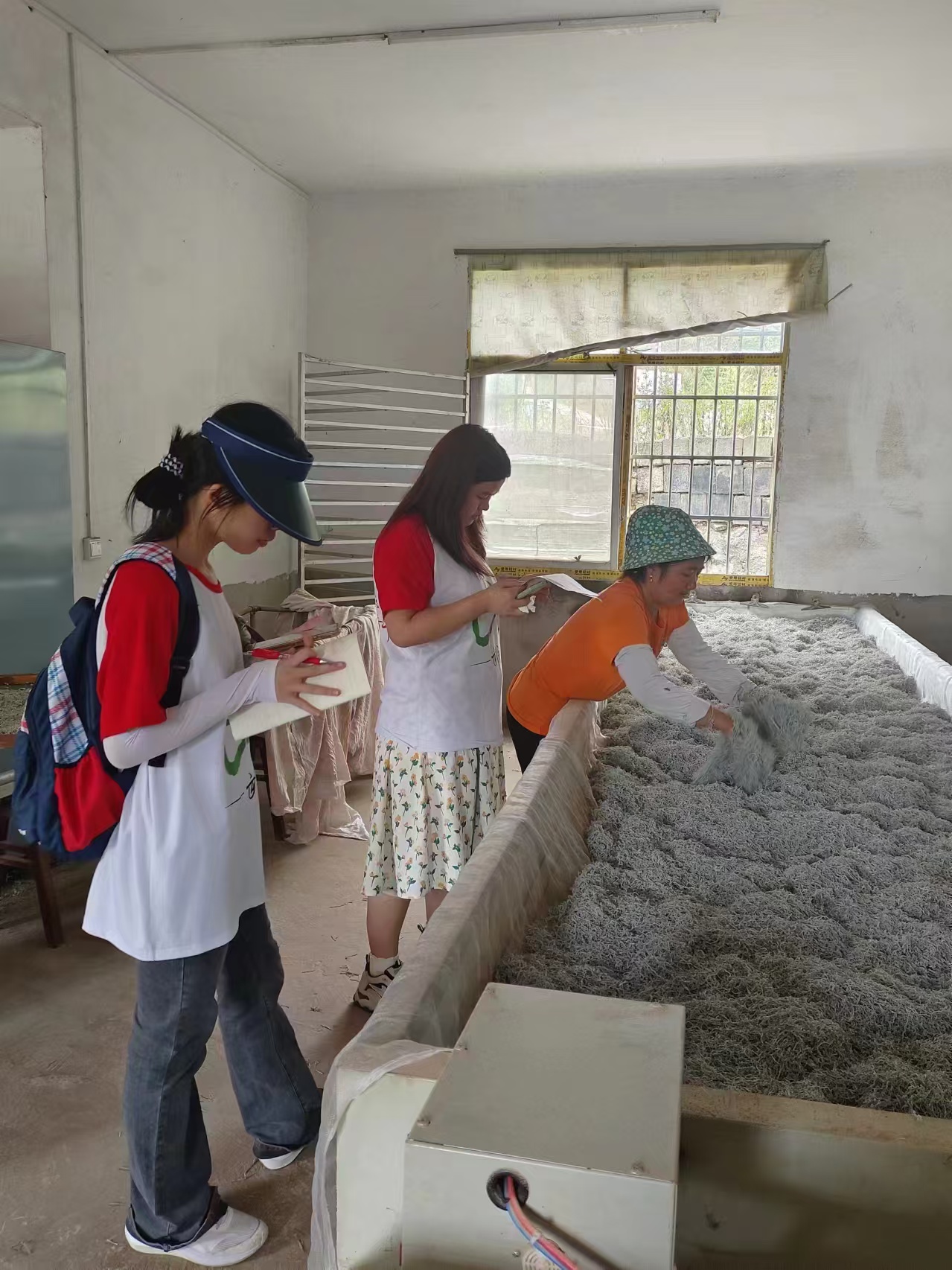 在调研采访中,成员们以莓茶销售情况为中心,围绕莓茶的种植条件、采摘情况,售卖情况等问题对农户开展采访工作。通过采访,成员们了解到在五官村中,前几年,由于天气等因素的影响,加上种植莓茶的农户还不是很多,因此莓茶生茶的单价维持在15元以上,最高甚至达到35元一斤,可观的市场前景与收入吸引了大量农户种植莓茶;而现在几乎家家户户都种植莓茶,村里也建立了许多莓茶加工小作坊,进行着系统规模化的莓茶加工管理,这些小作坊除了保证自身盈利之外,还会根据每年的莓茶的长势情况有选择性地收购村民手中积余的莓茶,并进行加工处理,造成市场上的莓茶供大于求,因此莓茶价格大跳水,今年甚至降至8元一斤,农户们目前对莓茶的规模化种植导致价格的下降表示担忧。
