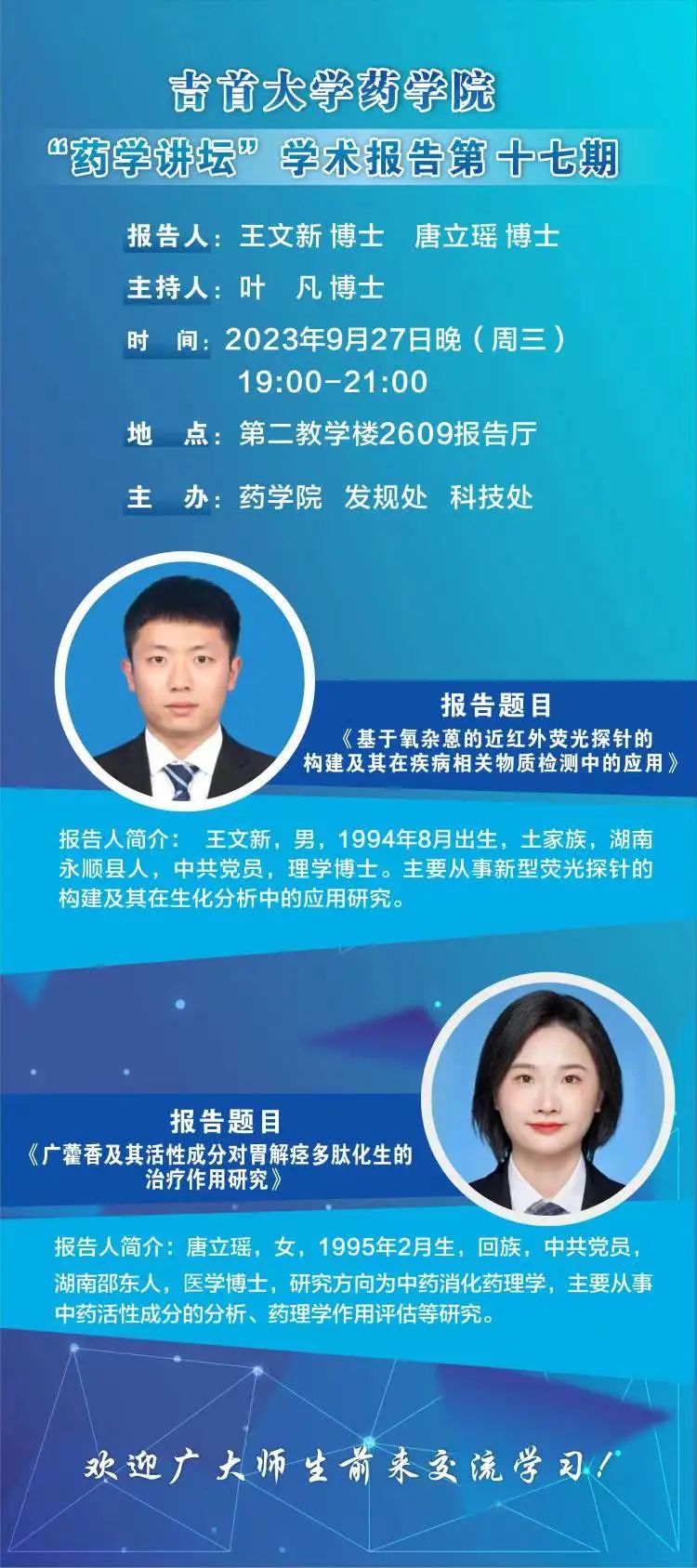 为进一步营造浓郁的学术氛围、促进学术交流,激发员工们的学习热情,9月27日晚,太阳集团tyc33455“药学讲坛”专家学术报告第17期于大田湾校区2609多功能报告厅举行。本期讲座由毕业于湘潭大学化学专业的王文新博士和毕业于广州中医药大学中药学专业的唐立瑶博士主讲,太阳集团tyc33455叶凡博士主持,太阳集团tyc33455经理陈功锡、副经理张朝晖、李先辉、实验中心副主任李贵、学科与科研办副主任成江、教务秘书白燕以及太阳集团tyc33455师生近200余人参加报告会。