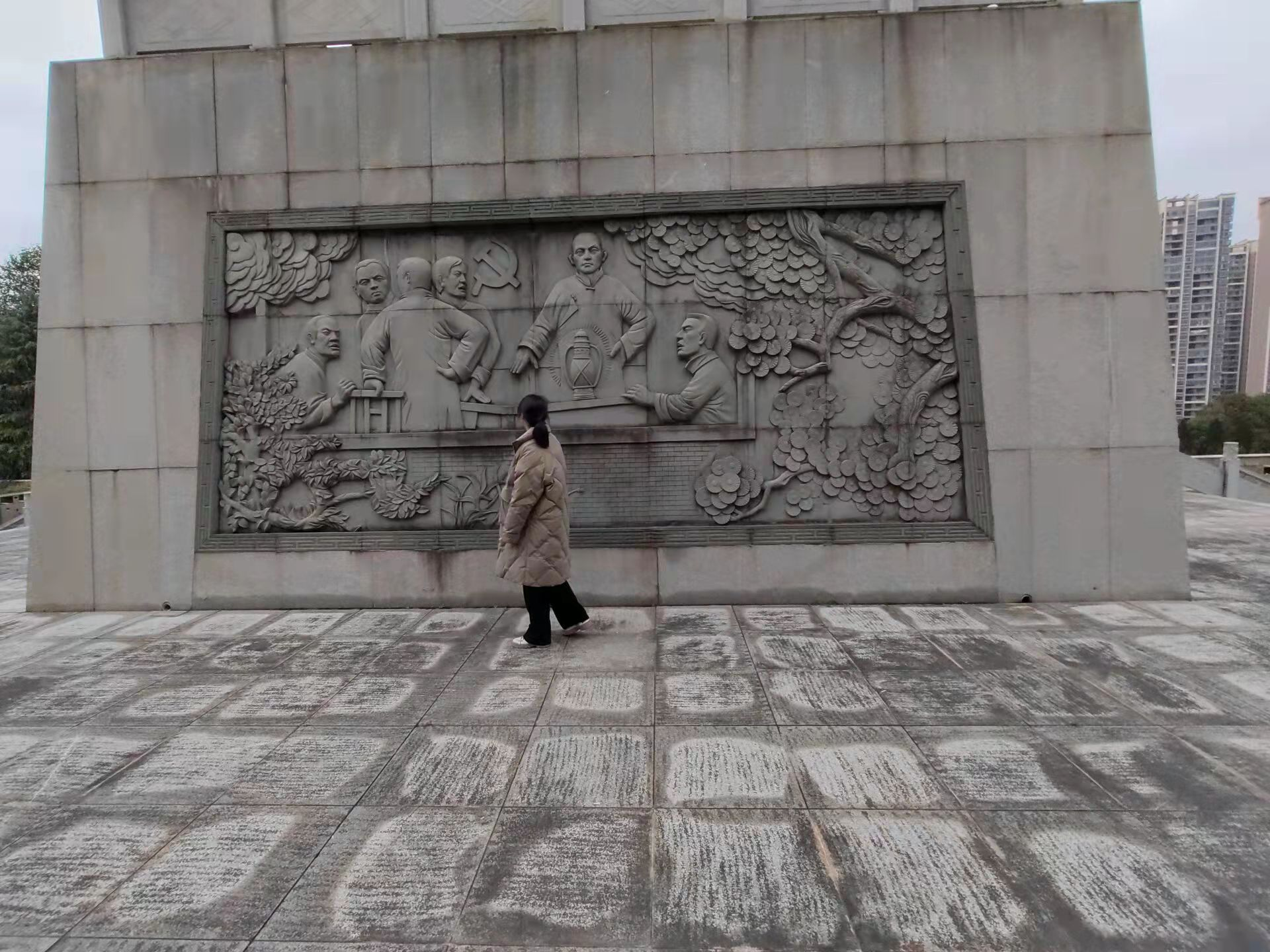 那个公园很大,有树、有花、有草、但更多的是人,无论是其乐融融的一家人,还是闹小矛盾的夫妻,还是相濡以沫的老夫老妻,当踏入通向纪念馆的楼梯,即使只能看见那高耸的纪念碑,却也只剩下沉默不语,我也如此。我渴望从雕刻画中找寻平江起义的残影,渴望从丰功伟绩中探寻出中国共产党胜利的过程,渴望从这片红色沃土中摸索出中国共产党领导人民站起来的答案。同样每天有大量的参观者纷至沓来,重温历史。