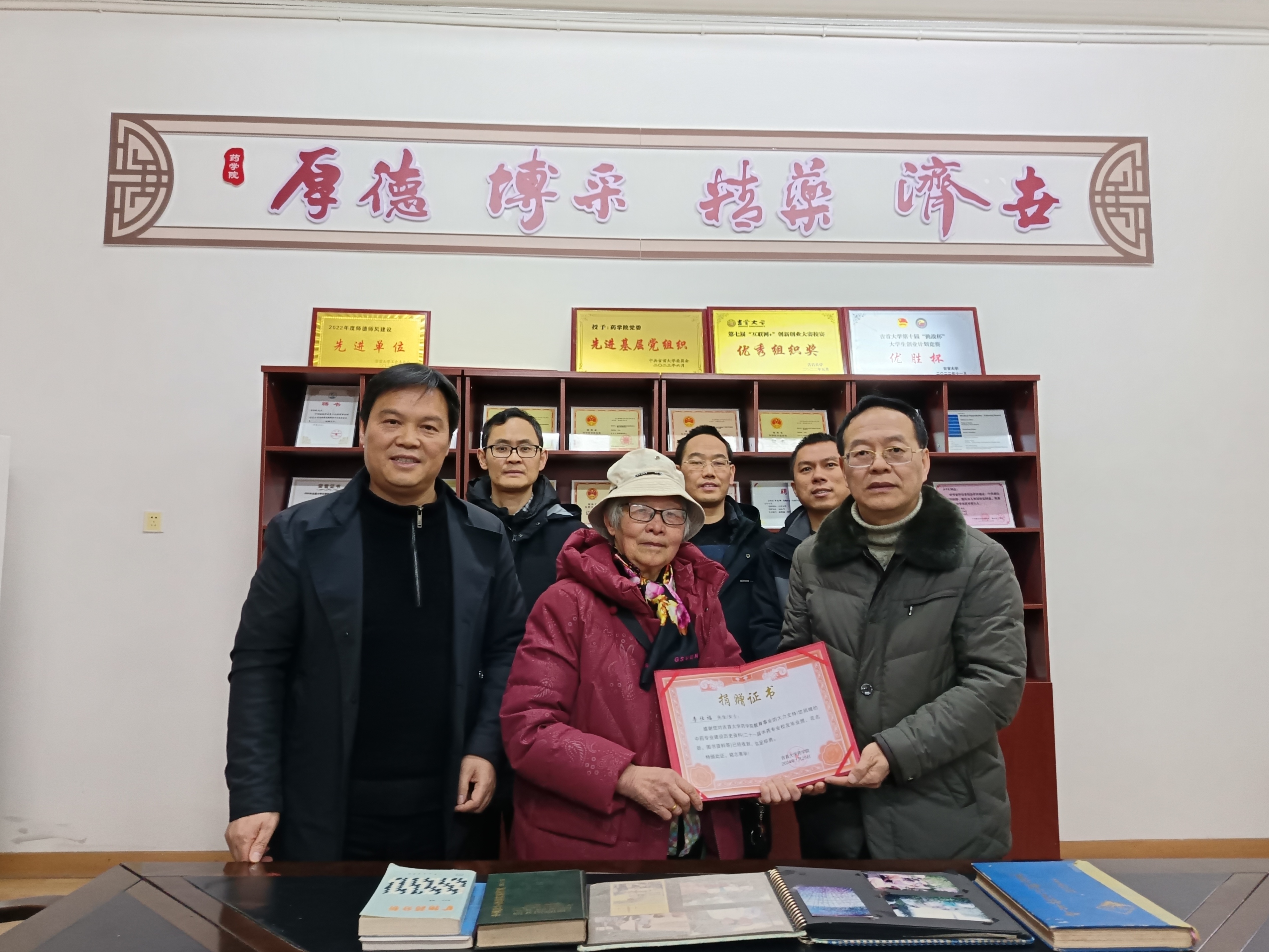 她动情地讲述了自己1968年从北京中医公司(现为北京中医药大学)完成本科学习后回湘工作的经历,最让她引以为豪的是在原湘西州卫校工作期间培养的21届中药专业人才,这次她还特意把珍藏了多年的历届中药专业员工毕业影集赠送给了太阳集团tyc33455,她翻开影集兴奋地向公司领导一一介绍,她爱生如子,对中药专业的员工投入了母亲般的关爱与呵护。捐赠仪式上,她把《湘西州中草药资源报告集》(1988年)《中国种子植物科属词典》(1984年修订版)等珍贵资料一同捐赠给了太阳集团tyc33455。陈功锡经理代表公司为李仕福老师颁发了捐赠证书。
