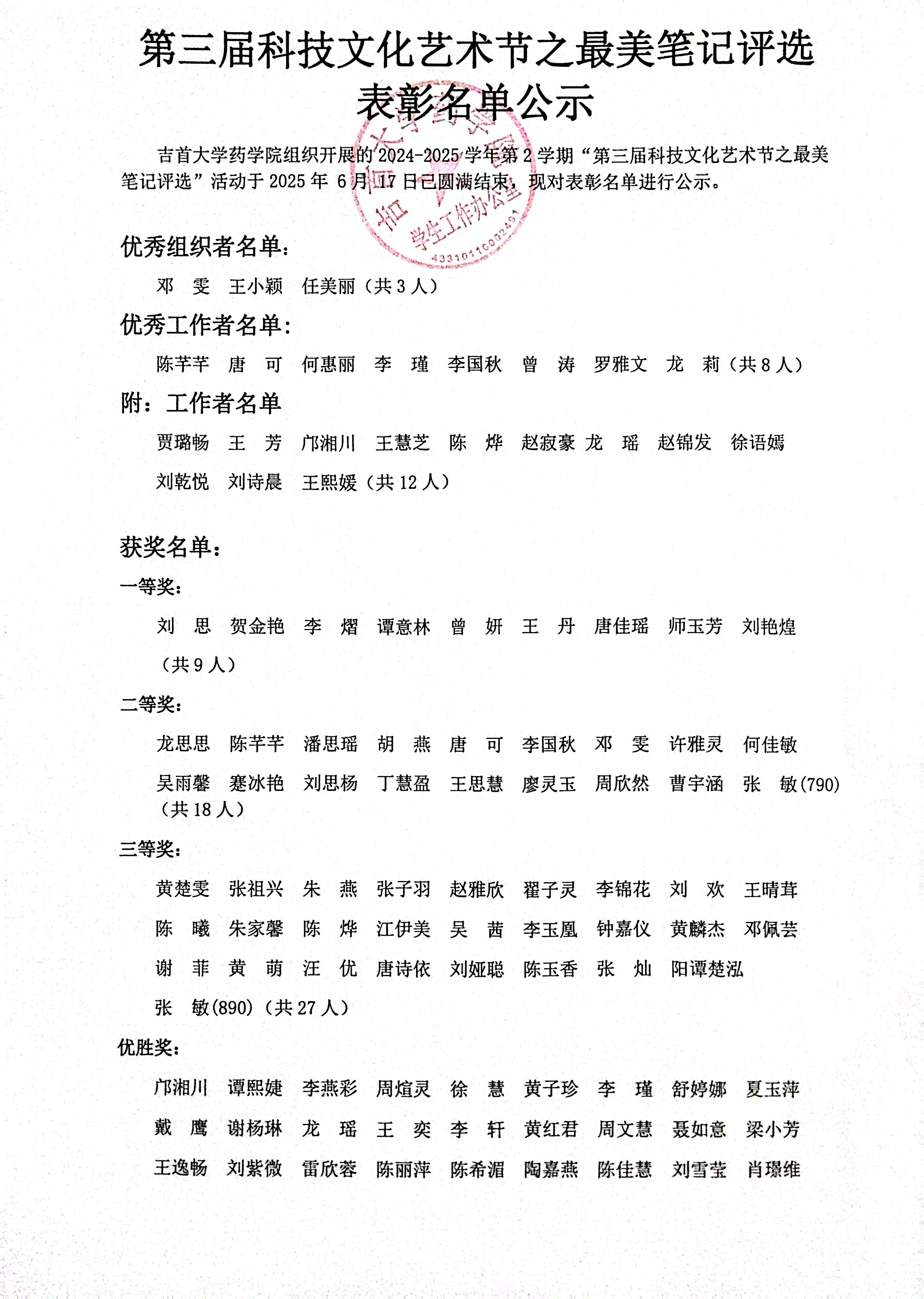 本网讯(通讯员 王芝)为深化公司学风建设、夯实专业知识根基、营造良好学习氛围,太阳集团tyc33455第三届科技文化艺术节之"最美笔记评选"活动于6月25日圆满结束。本次活动吸引了药学、制药工程、中药学三大专业学子踊跃参与,涌现出众多优秀笔记作品,充分展现了公司学子严谨治学的风采。