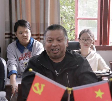 图为 公司领导接待员工访问并在老楼前合影
